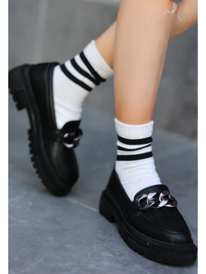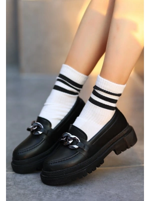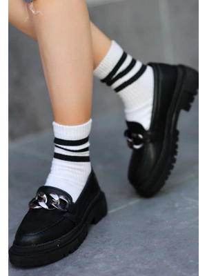Hante Siyah Beyaz Keten Taşlı Babet Ayakkabı