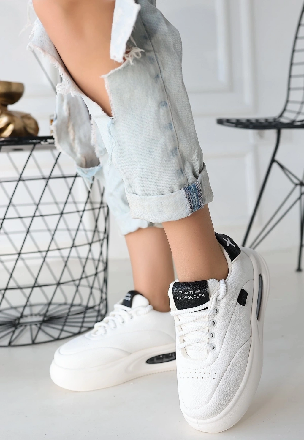 Chris Beyaz Cilt Siyah Detaylı Bağcıklı Spor Ayakkabı